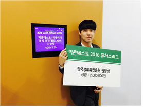 수학과 3학년 원민섭 학생이 지난 11월 3일, 한국정보화진흥원과 한국 빅데이터연합회가 주최한 ‘제4회 빅콘테스트 퓨처스리그’에서 영화 관객 수 예측 프로젝트에 참여해 한국정보화진흥원 원장상을 수상했습니다. 원민섭 학생은 충남대 대학원 수학과 및 컴퓨터공학과 이경훈 학생, 무역학과 진하윤 학생과 함께 ‘Octopus'팀을 구성하여 콘테스트에 참가하였습니다.‘Octopus’팀은, 올해 6월 24일~7월 2일 제주도에서 열린 빅데이터 여름학교에서 만나 프로젝트를 구상했으며 한 달간 연구한 끝에 경진대회에 참가해 입상했습니다. 고등학생부터 대학원생까지 총 219팀이 이 대회에 참가했으며, 본선에 진출한 9개 팀 가운데 ‘Octopus’팀이 한국정보화진흥원 원장상을 수상해, 상금 200만 원을 받았습니다. 프로젝트를 수행하는 과정에서 팀 전체가 다중 회귀 분석을 사용하였고 특히 원민섭 학생은 크롤링으로 자료를 뽑아내고 데이터를 가공하는 역할을 도맡아 하였습니다. 그 결과 최근 2년간의 영화데이터를 기반으로 개봉 전 영화, 고산자, 매그니피센트 7, 카페 소사이어티의 누적 관객 수를 가장 적은 오차로 예측하는 결과를 얻었습니다. 이번 수상으로 ‘Octopus’팀 구성원들에게 SK텔레콤, LG전자, 다음소프트, 와이즈넛 등에서 인턴사원의 기회가 주어집니다.