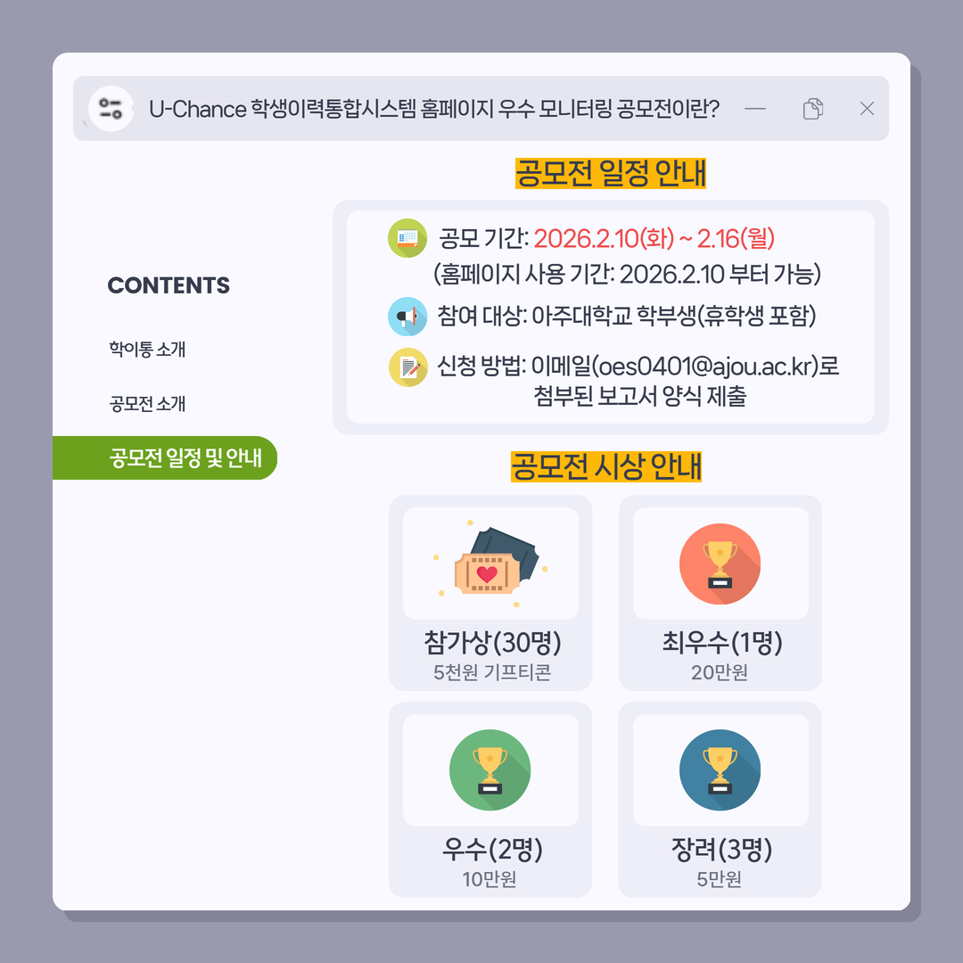U-Chance ํ์์ด๋ ฅํตํฉ์์คํ ๋ฐ๋ก๊ฐ๊ธฐ : ์์ฃผ๋ํ๊ต ์ญ๋๊ด๋ฆฌ์์คํ